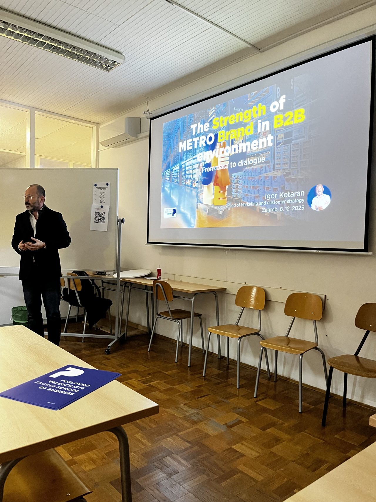 U sklopu kolegija Poslovni marketing, 8. prosinca održano je gostujuće predavanje Igora Kotarana, direktora marketinga i razvoja strategije kupaca u METRO Hrvatska, na temu “Put do lidera na HORECA tržištu”.